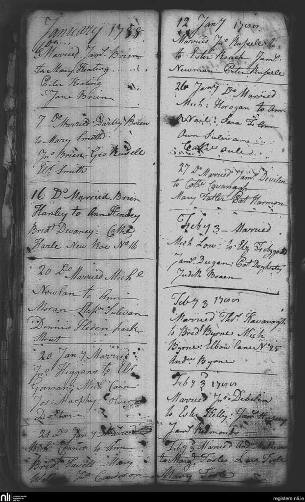 St. Nicholas', Dublin city; County of Dublin; Archdiocese of Dublin. Marriages, Jan. 1788 to Feb. 1788