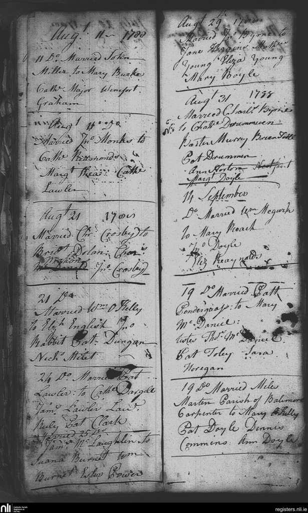 St. Nicholas', Dublin city; County of Dublin; Archdiocese of Dublin. Marriages, Aug. 1788 to Sep. 1788