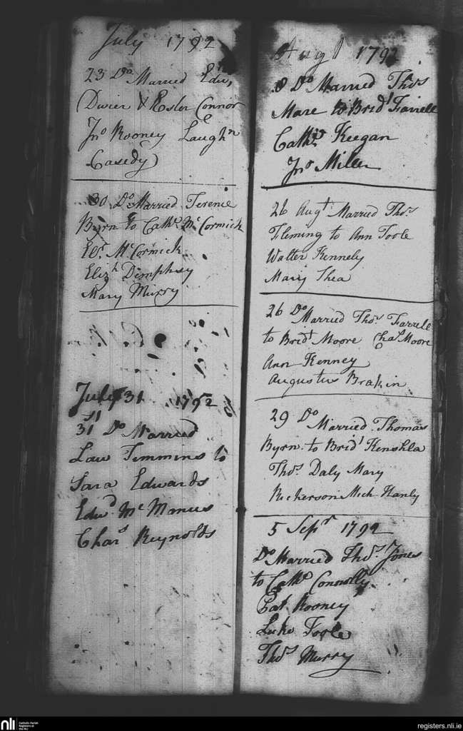 St. Nicholas', Dublin city; County of Dublin; Archdiocese of Dublin. Marriages, July 1792 to Sep. 1792