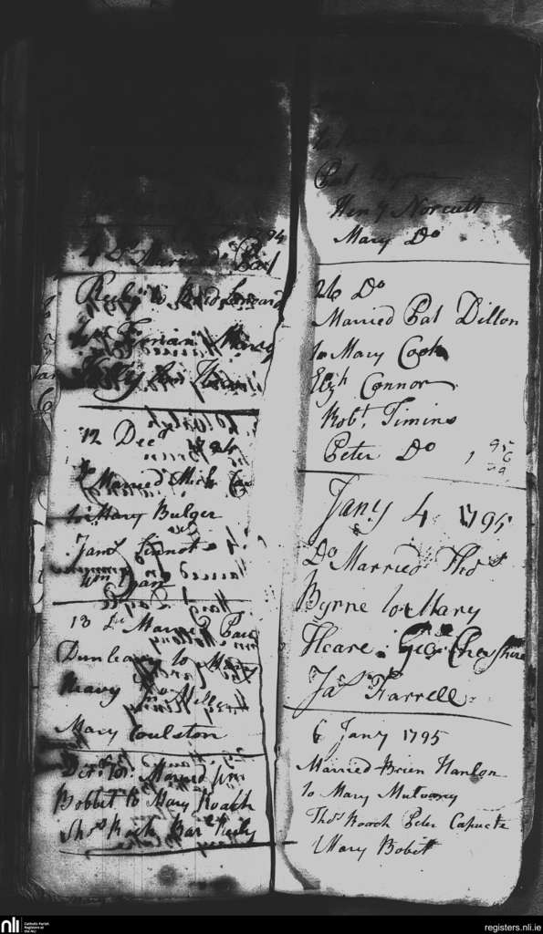 St. Nicholas', Dublin city; County of Dublin; Archdiocese of Dublin. Marriages, Dec. 1794 to Jan. 1795