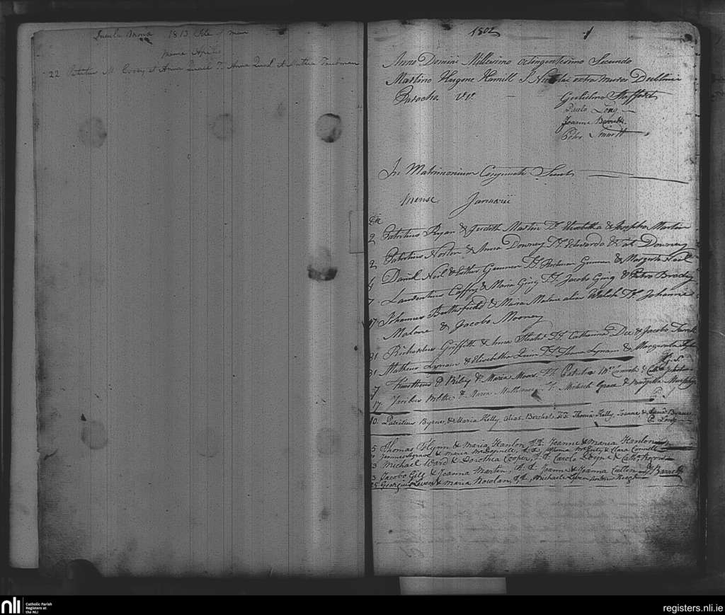 St. Nicholas', Dublin city; County of Dublin; Archdiocese of Dublin. Marriages, Jan. 1802 to Apr. 1813