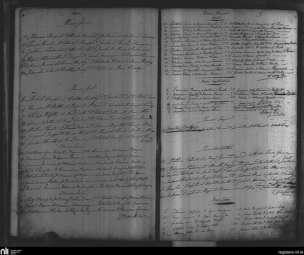 St. Nicholas', Dublin city; County of Dublin; Archdiocese of Dublin. Marriages, June 1802 to Sep. 1802