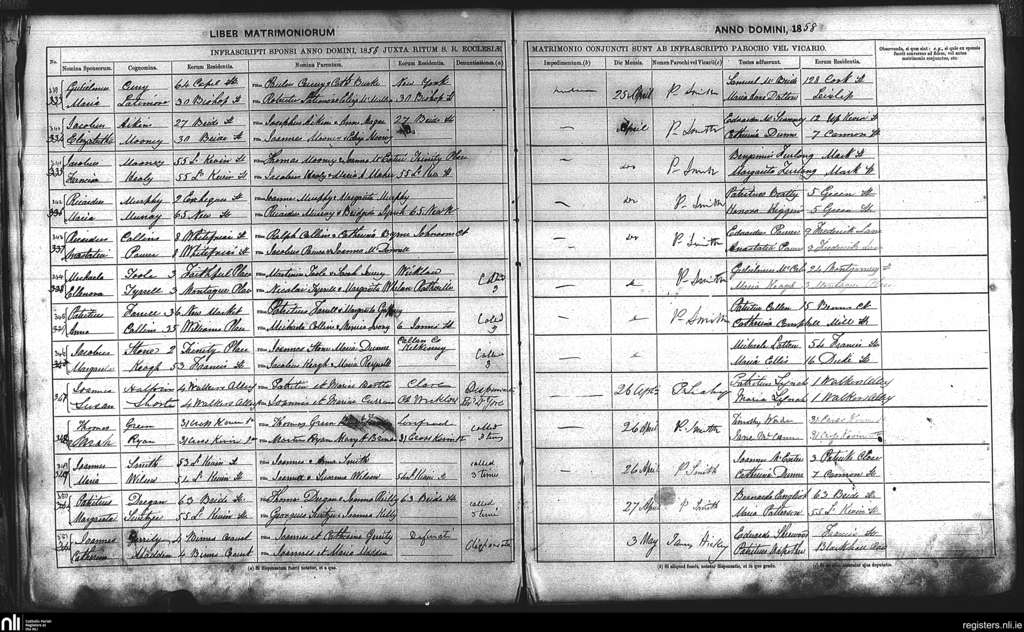St. Nicholas', Dublin city; County of Dublin; Archdiocese of Dublin. Marriages, Apr. 1858 to May 1858