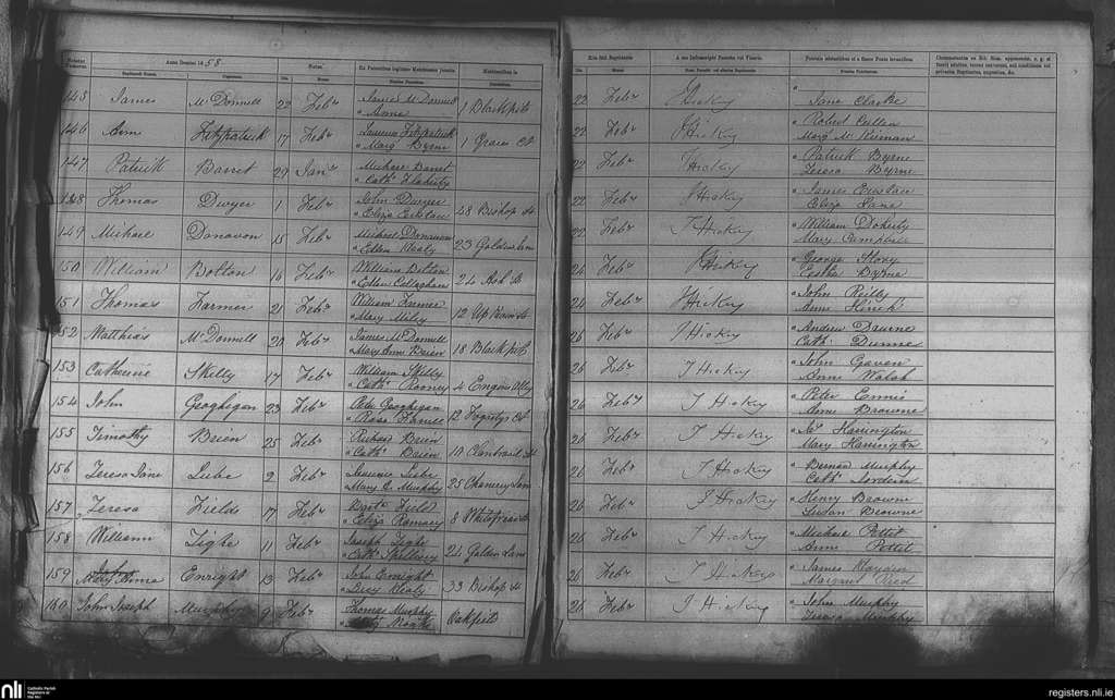 St. Nicholas', Dublin city; County of Dublin; Archdiocese of Dublin. Baptisms, Feb. 1858