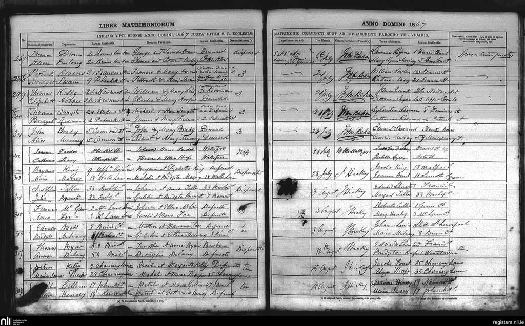 St. Nicholas', Dublin city; County of Dublin; Archdiocese of Dublin. Marriages, July 1867 to Aug. 1867