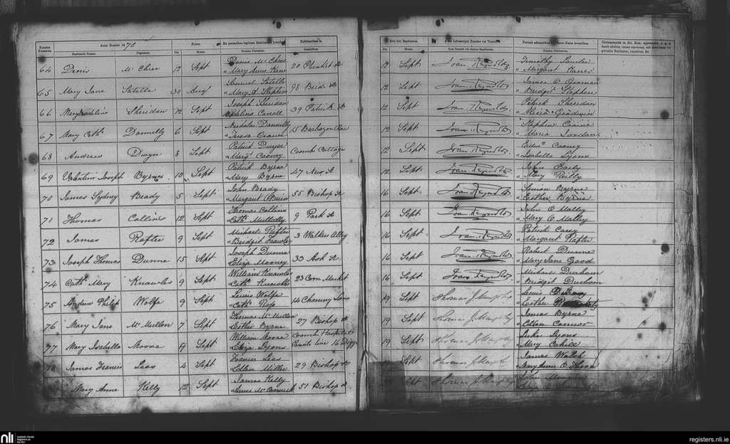 St. Nicholas', Dublin city; County of Dublin; Archdiocese of Dublin. Baptisms, Sep. 1870