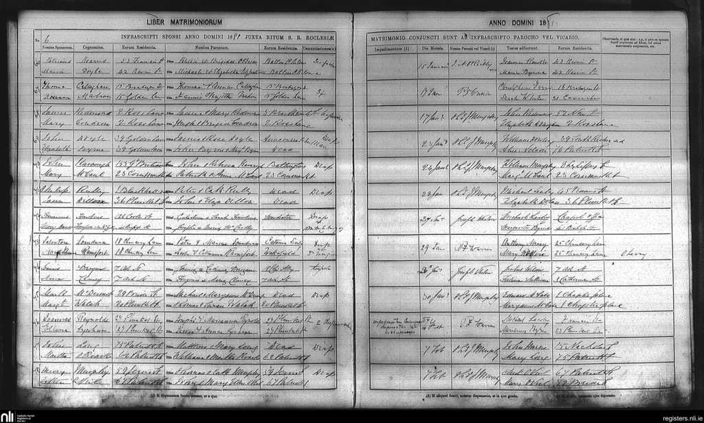 St. Nicholas', Dublin city; County of Dublin; Archdiocese of Dublin. Marriages, Jan. 1881 to Feb. 1881