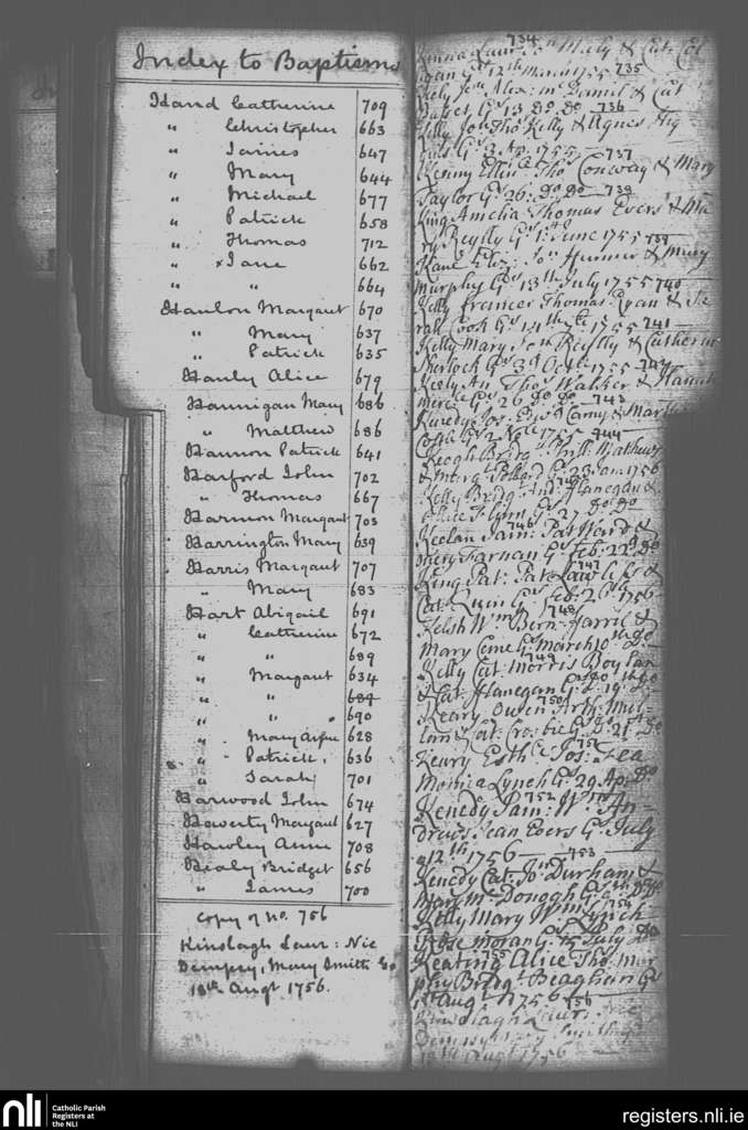 St. Paul's, Dublin city; County of Dublin; Archdiocese of Dublin. Baptisms, Mar. 1755 to Aug. 1756