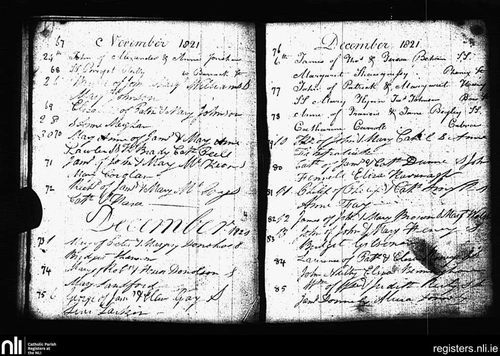 St. Paul's, Dublin city; County of Dublin; Archdiocese of Dublin. Baptisms, Nov. 1821 to Dec. 1821