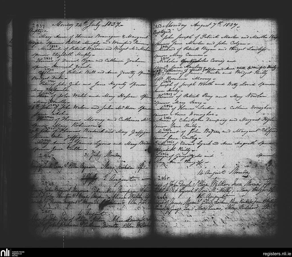 St. Paul's, Dublin city; County of Dublin; Archdiocese of Dublin. Baptisms, July 1837 to Aug. 1837