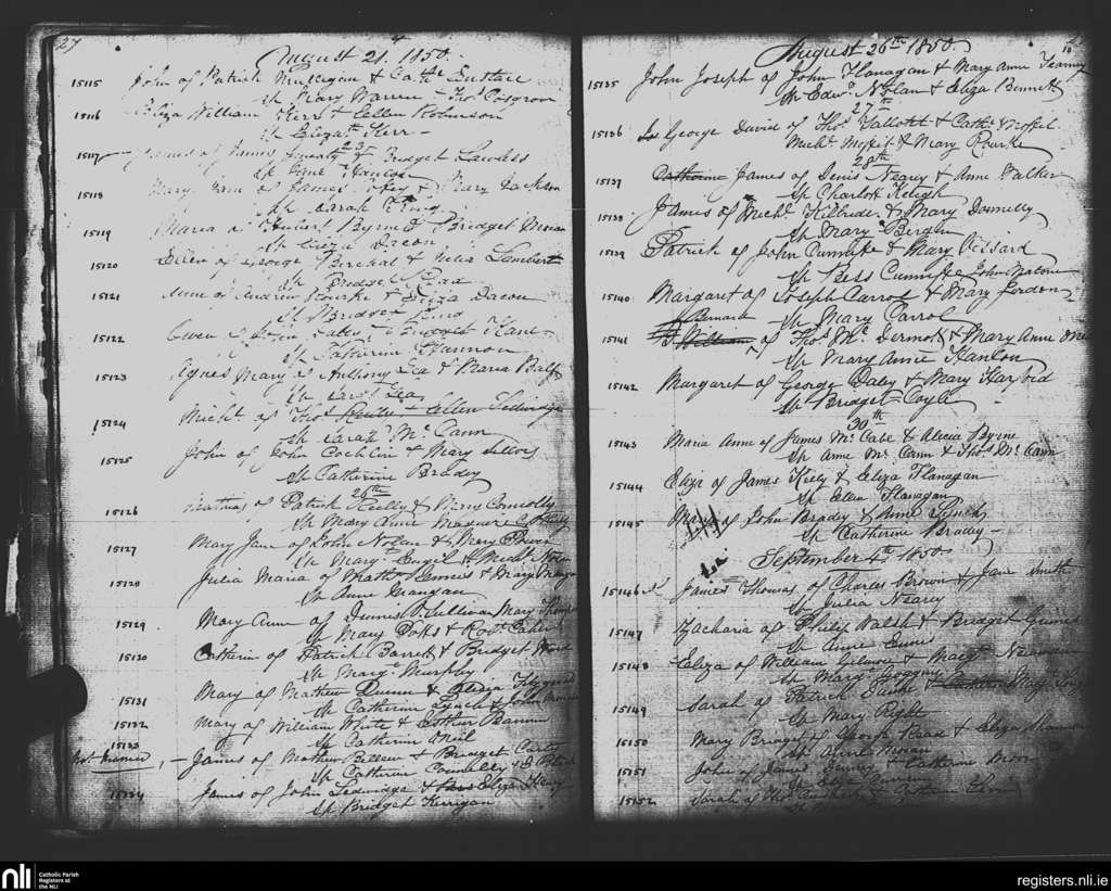 St. Paul's, Dublin city; County of Dublin; Archdiocese of Dublin. Baptisms, Aug. 1850 to Sep. 1850