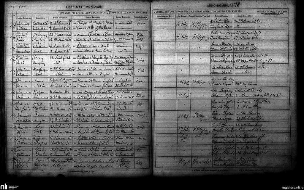 St. Paul's, Dublin city; County of Dublin; Archdiocese of Dublin. Marriages, July 1878 to Aug. 1878
