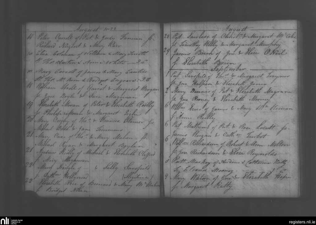 Swords; County of Dublin; Archdiocese of Dublin. Baptisms, Aug. 1822 to Sep. 1822