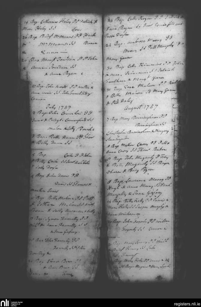 Booterstown; County of Dublin; Archdiocese of Dublin. Baptisms, June 1757 to Aug. 1757