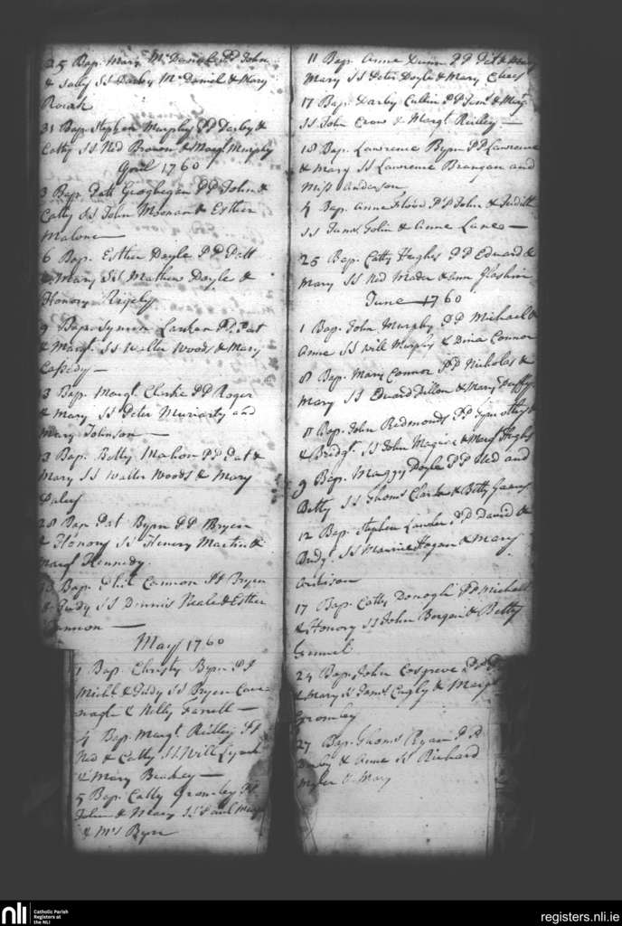 Booterstown; County of Dublin; Archdiocese of Dublin. Baptisms, Mar. 1760 to June 1760