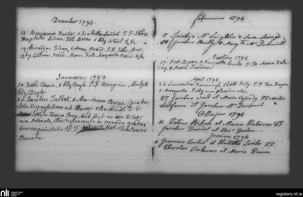 Booterstown; County of Dublin; Archdiocese of Dublin. Marriages, Dec. 1793 to June 1794