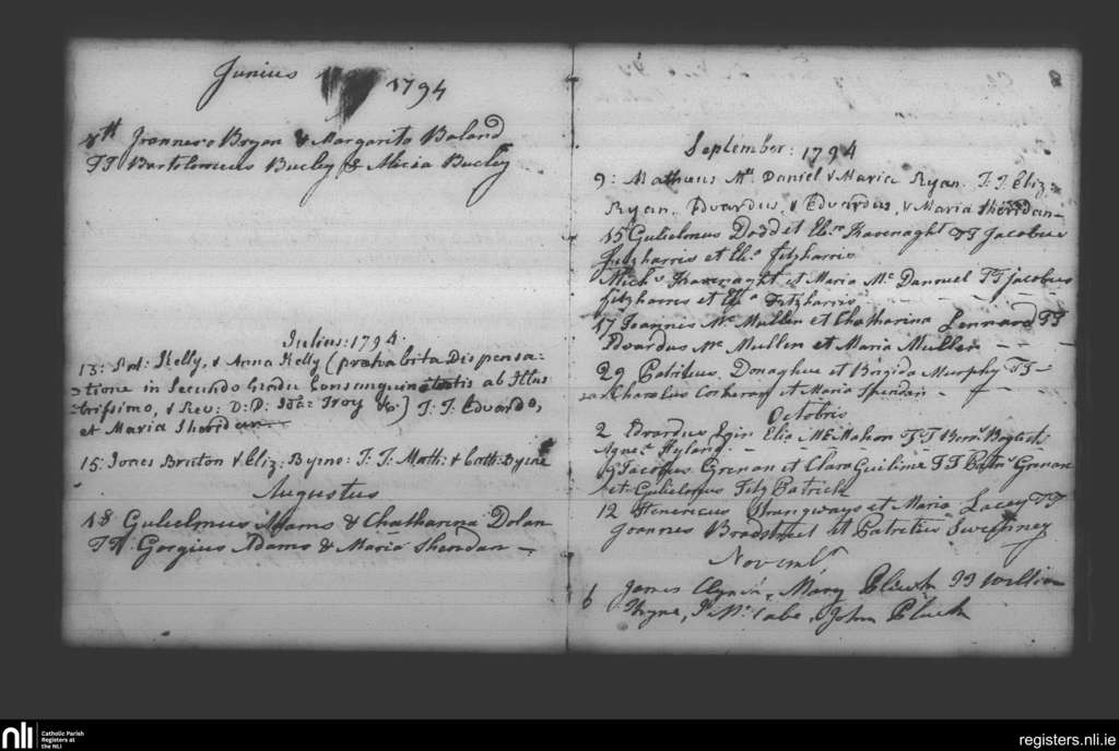 Booterstown; County of Dublin; Archdiocese of Dublin. Marriages, June 1794 to Nov. 1794