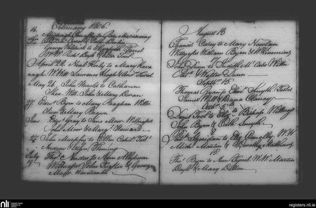 Booterstown; County of Dublin; Archdiocese of Dublin. Marriages, Feb. 1806 to Oct. 1806