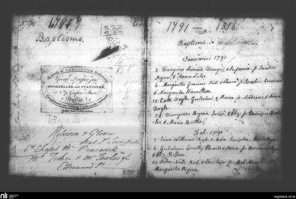 Booterstown; County of Dublin; Archdiocese of Dublin. Baptisms, Jan. 1791 to Feb. 1791