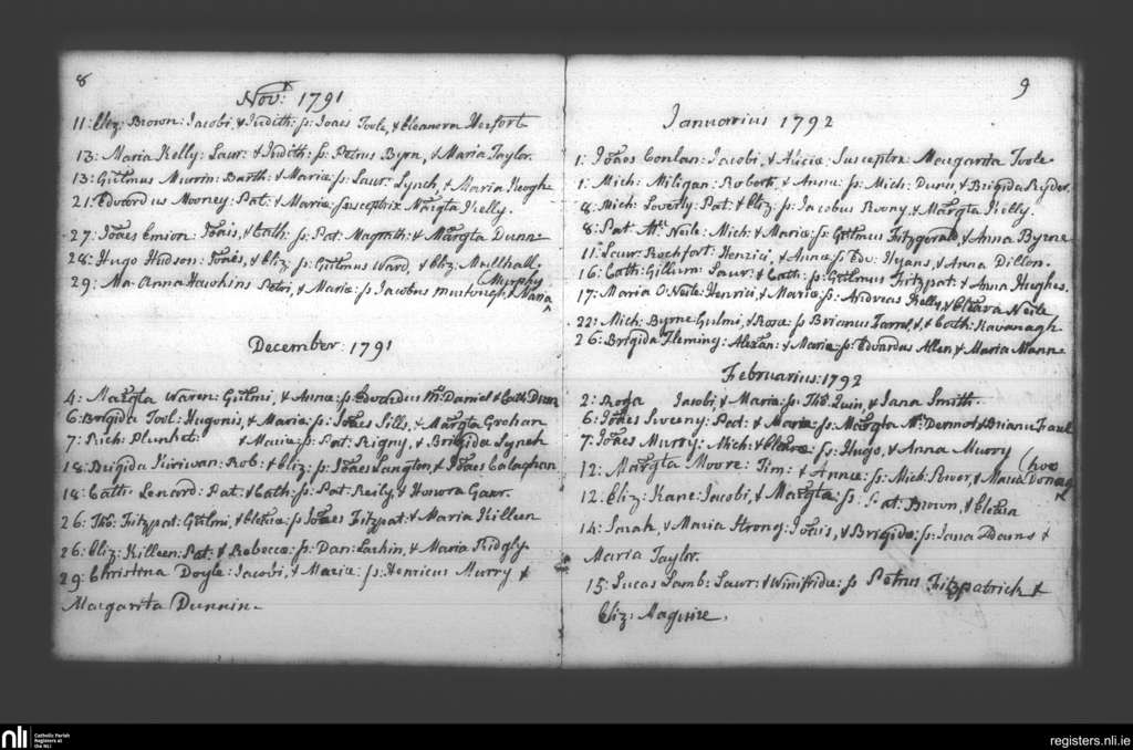 Booterstown; County of Dublin; Archdiocese of Dublin. Baptisms, Nov. 1791 to Feb. 1792