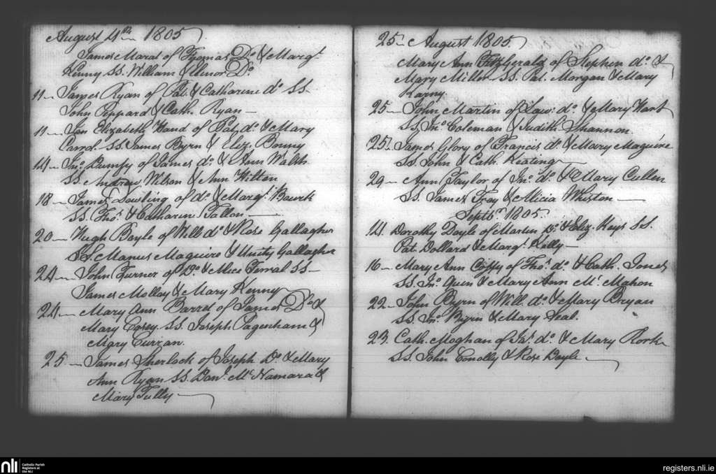 Booterstown; County of Dublin; Archdiocese of Dublin. Baptisms, Aug. 1805 to Sep. 1805