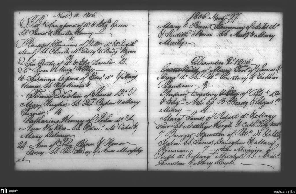 Booterstown; County of Dublin; Archdiocese of Dublin. Baptisms, Nov. 1806 to Dec. 1806