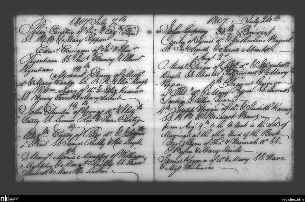 Booterstown; County of Dublin; Archdiocese of Dublin. Baptisms, July 1807 to Aug. 1807