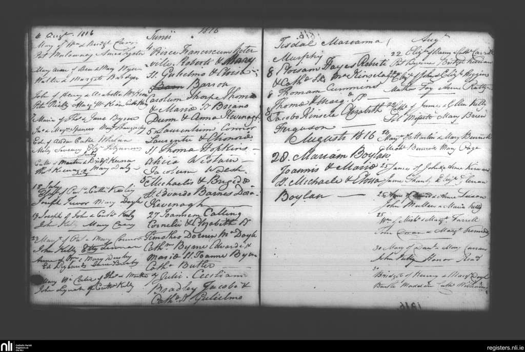 Booterstown; County of Dublin; Archdiocese of Dublin. Baptisms, June 1816 to Aug. 1816