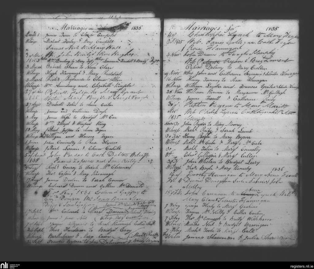 Booterstown; County of Dublin; Archdiocese of Dublin. Marriages, Mar. 1835 to Feb. 1836
