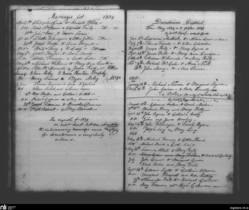 Booterstown; County of Dublin; Archdiocese of Dublin. Marriages, Jan. 1835 to Nov. 1839