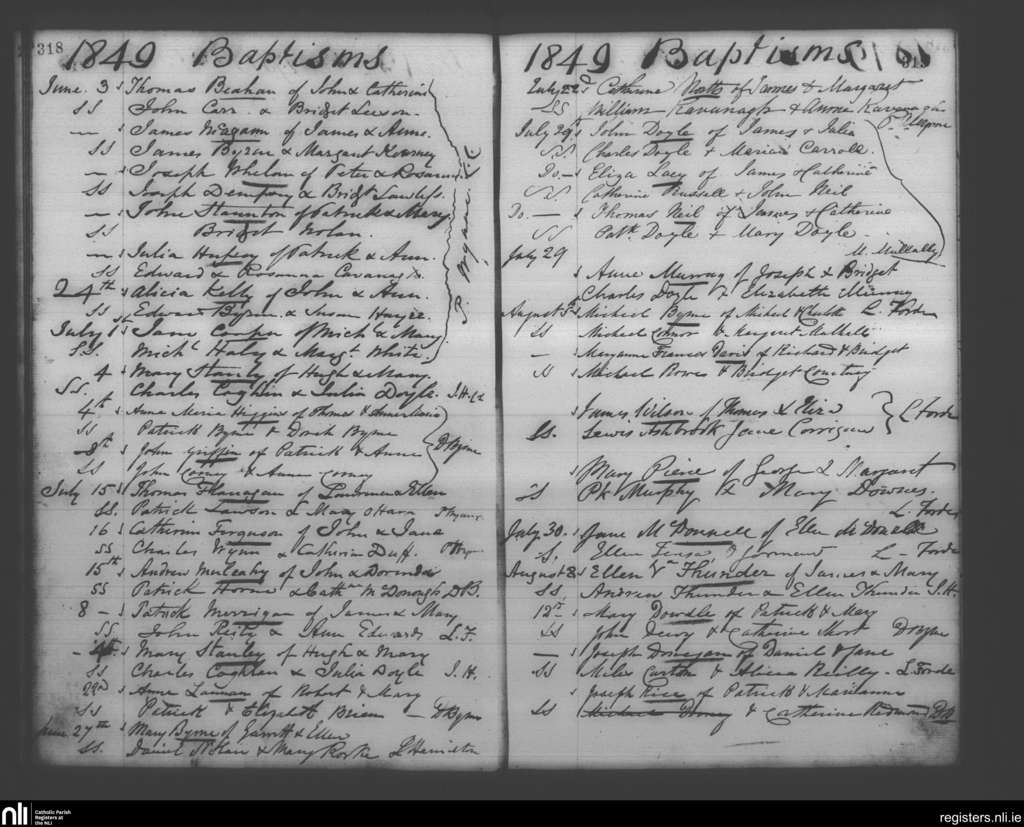 Booterstown; County of Dublin; Archdiocese of Dublin. Baptisms, June 1849 to Aug. 1849