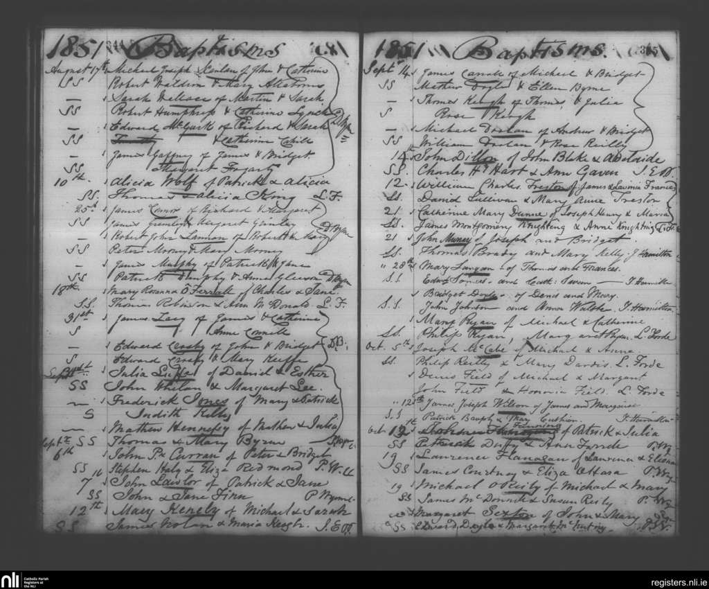 Booterstown; County of Dublin; Archdiocese of Dublin. Baptisms, Aug. 1851 to Oct. 1851