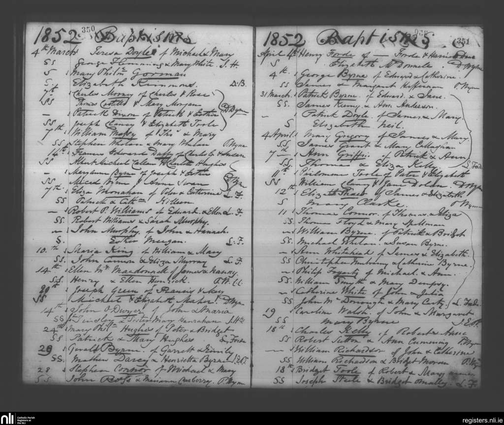 Booterstown; County of Dublin; Archdiocese of Dublin. Baptisms, Mar. 1852 to Apr. 1852