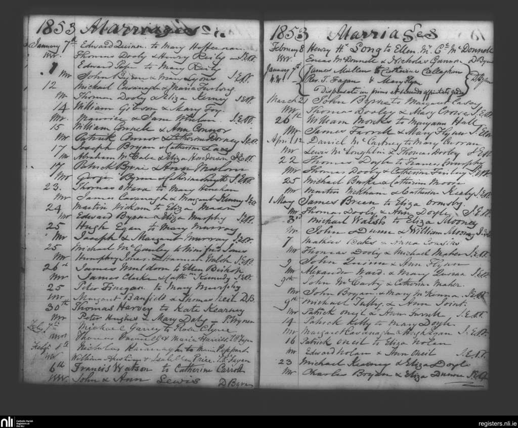 Booterstown; County of Dublin; Archdiocese of Dublin. Marriages, Jan. 1853 to May 1853