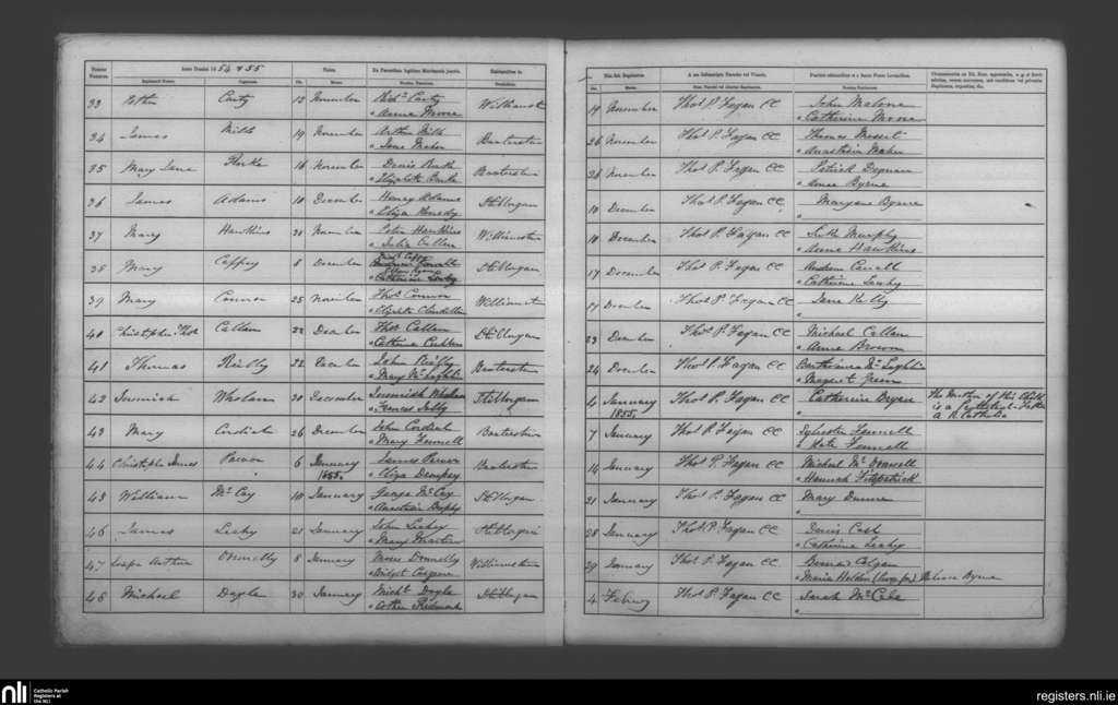 Booterstown; County of Dublin; Archdiocese of Dublin. Baptisms, Nov. 1854 to Feb. 1855