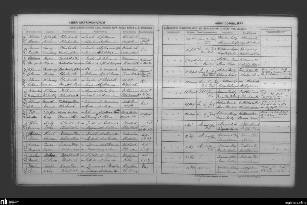 Booterstown; County of Dublin; Archdiocese of Dublin. Marriages, July 1865 to Sep. 1865