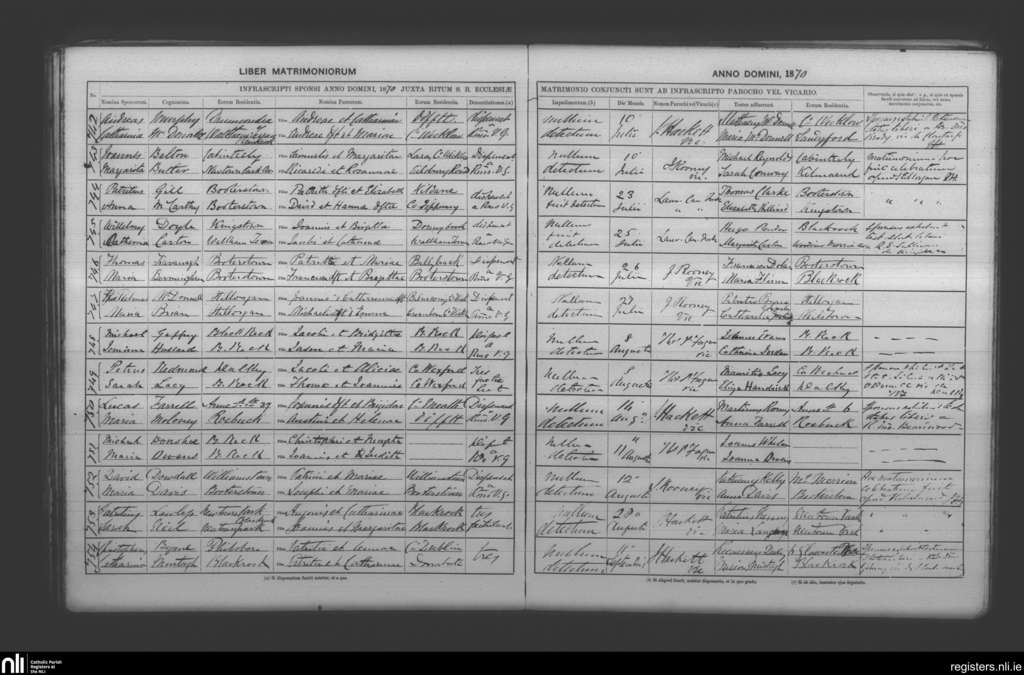 Booterstown; County of Dublin; Archdiocese of Dublin. Marriages, July 1870 to Sep. 1870