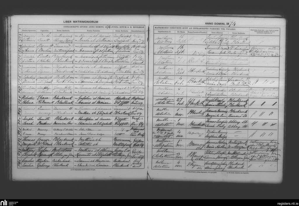 Booterstown; County of Dublin; Archdiocese of Dublin. Marriages, Sep. 1874 to Nov. 1874