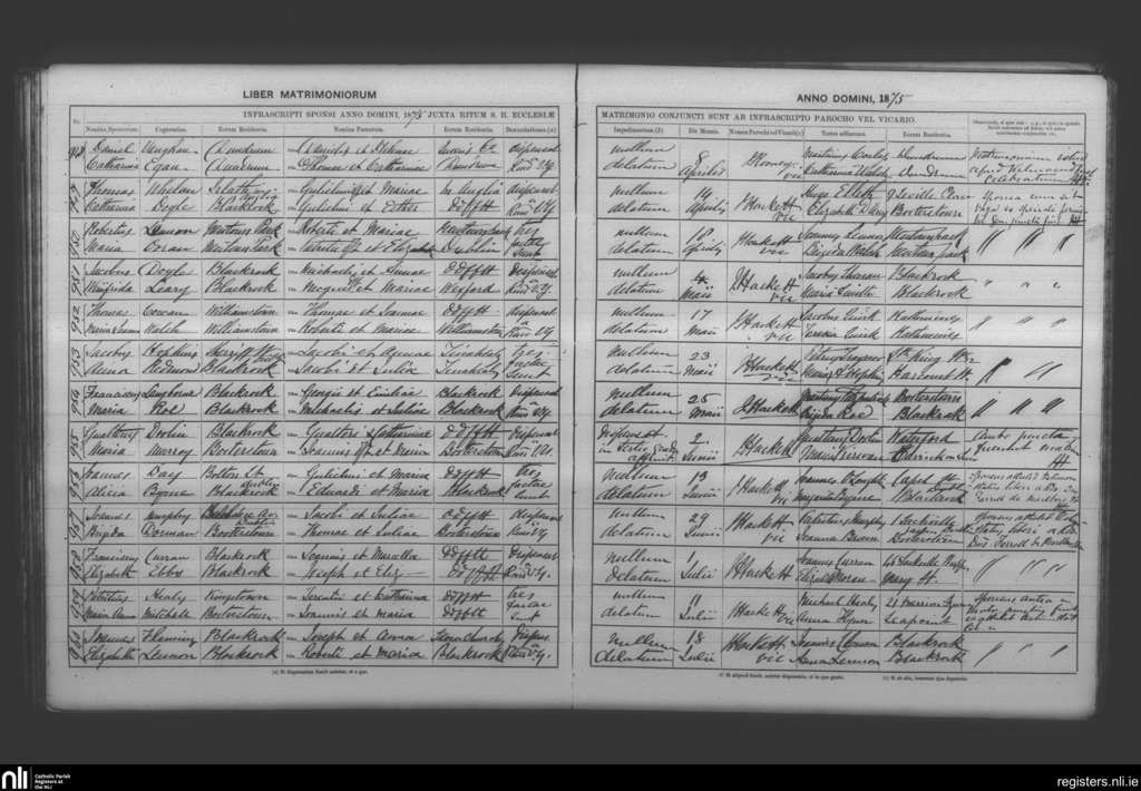 Booterstown; County of Dublin; Archdiocese of Dublin. Marriages, Apr. 1875 to July 1875