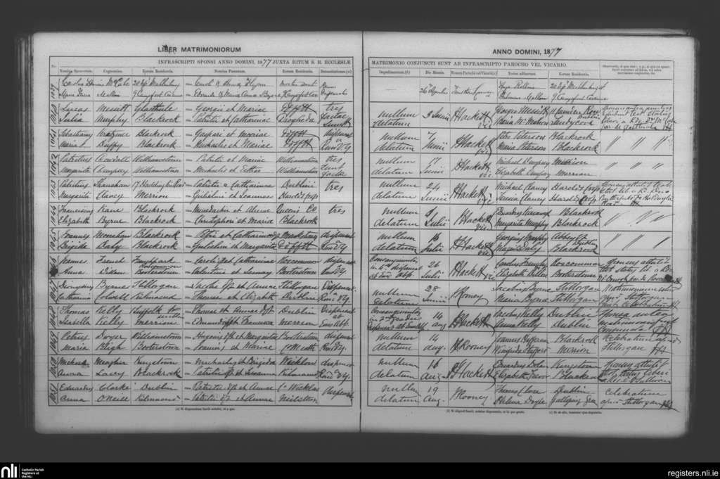 Booterstown; County of Dublin; Archdiocese of Dublin. Marriages, Apr. 1877 to Aug. 1877