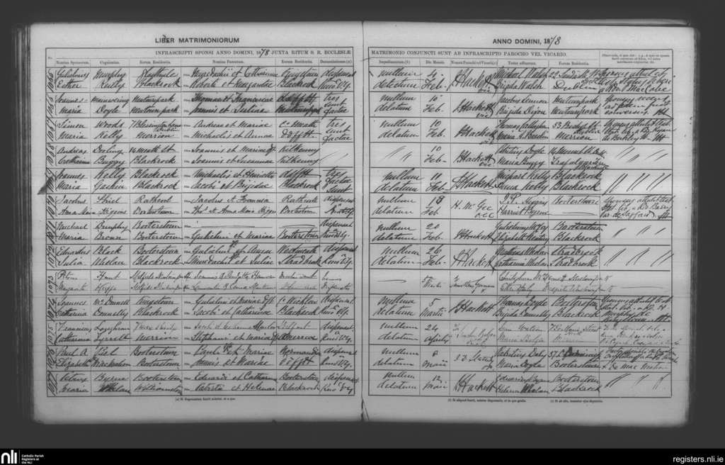 Booterstown; County of Dublin; Archdiocese of Dublin. Marriages, Feb. 1878 to May 1878