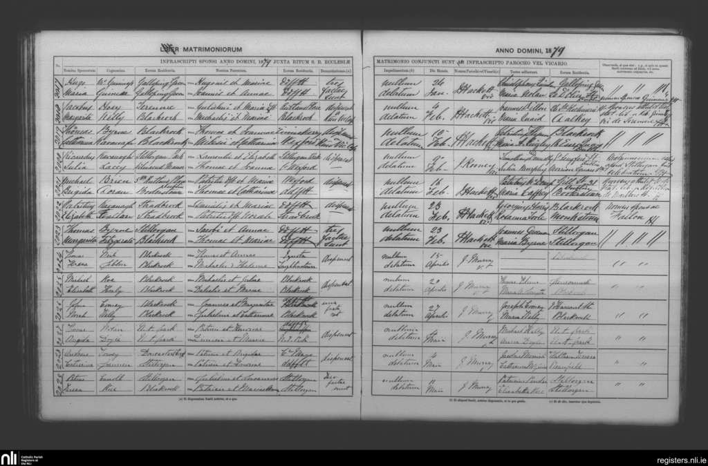 Booterstown; County of Dublin; Archdiocese of Dublin. Marriages, Jan. 1879 to May 1879