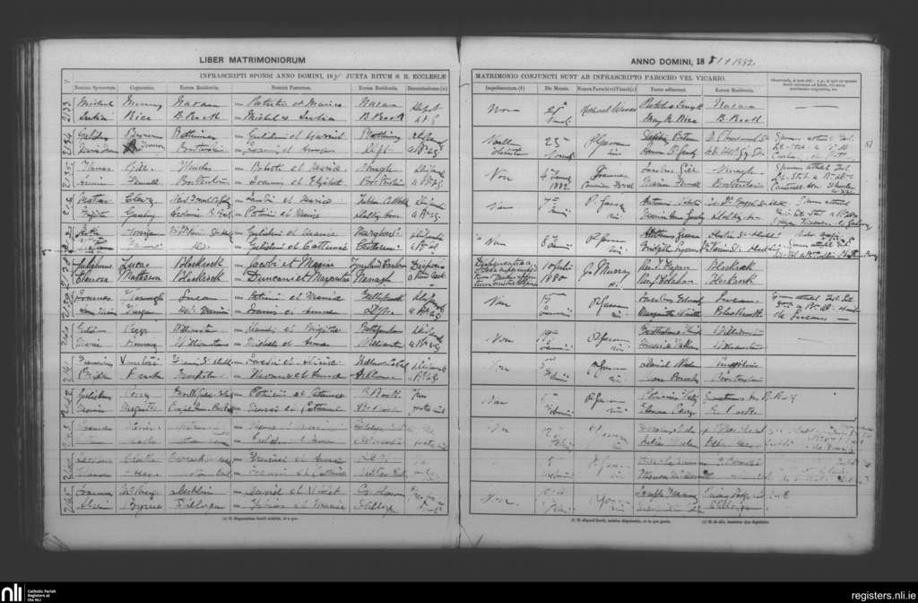 Booterstown; County of Dublin; Archdiocese of Dublin. Marriages, July 1880 to Feb. 1882