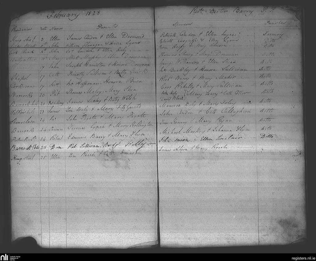 Fermoy; County of Cork; Diocese of Cloyne. Baptisms, Feb. 1828