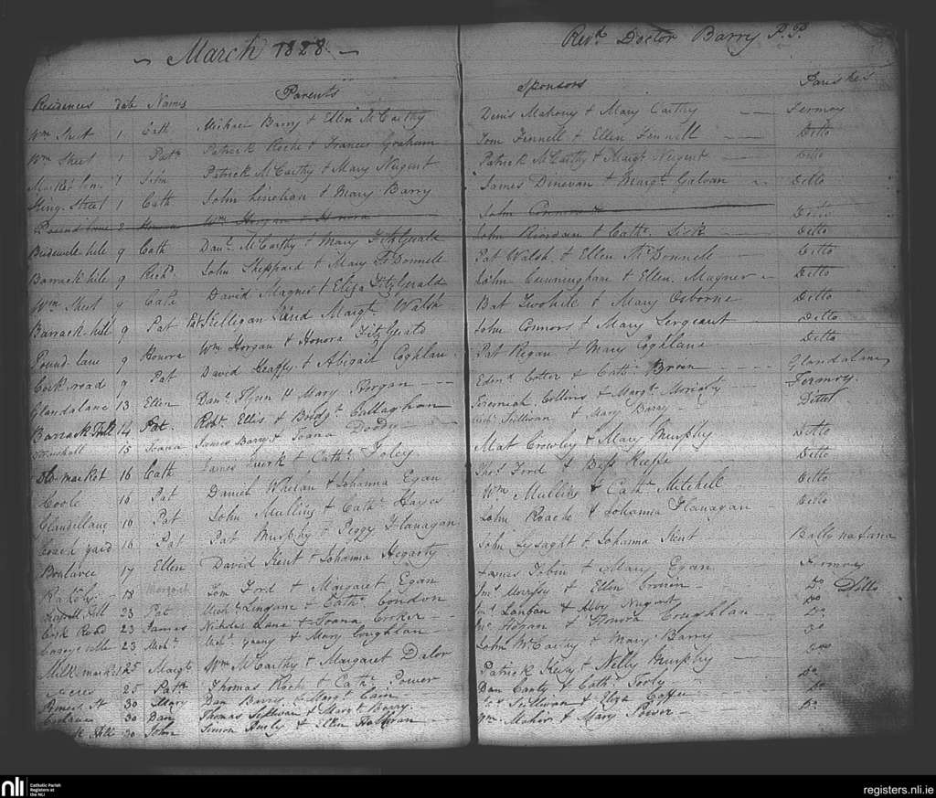 Fermoy; County of Cork; Diocese of Cloyne. Baptisms, Mar. 1828