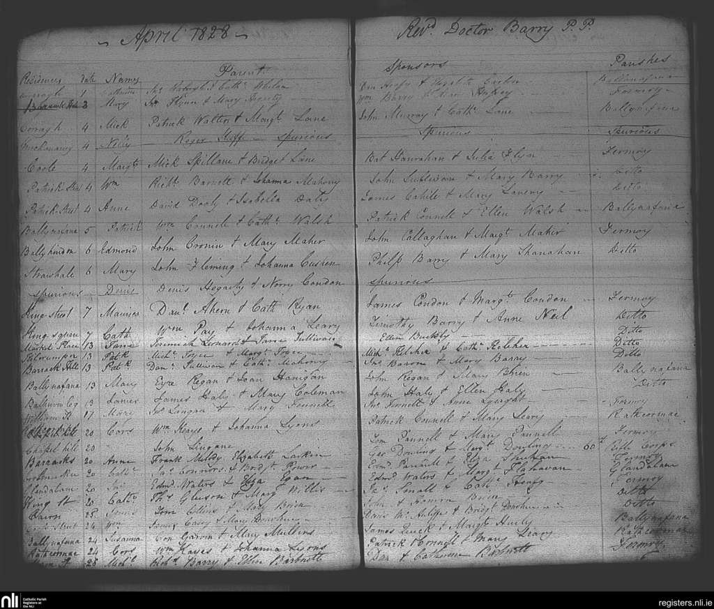 Fermoy; County of Cork; Diocese of Cloyne. Baptisms, Apr. 1828