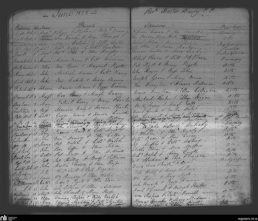 Fermoy; County of Cork; Diocese of Cloyne. Baptisms, June 1828