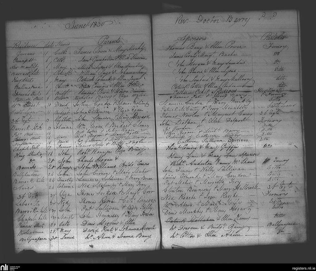 Fermoy; County of Cork; Diocese of Cloyne. Baptisms, June 1830