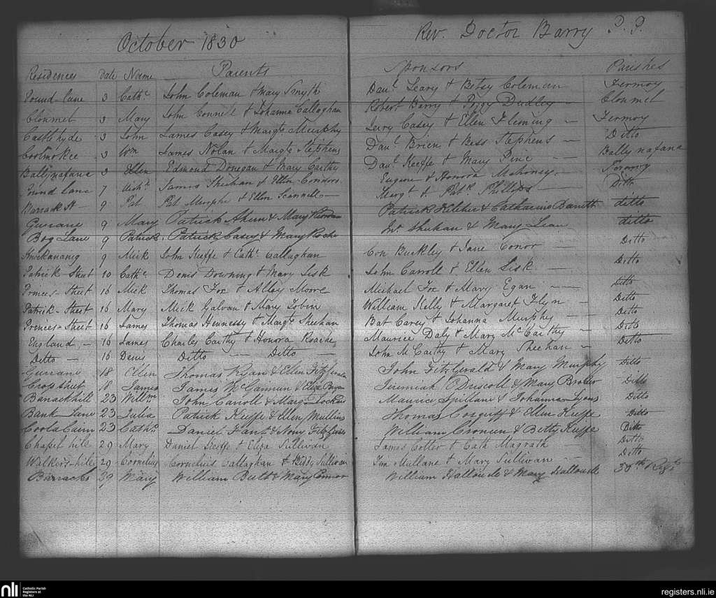 Fermoy; County of Cork; Diocese of Cloyne. Baptisms, Oct. 1830
