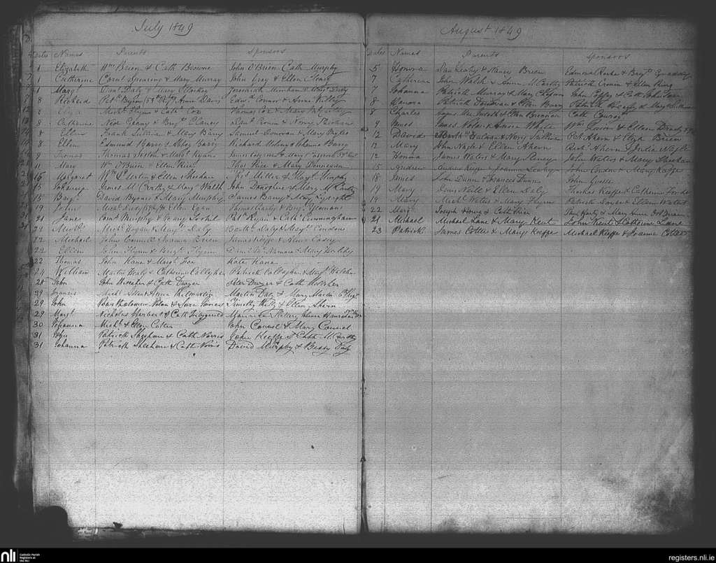 Fermoy; County of Cork; Diocese of Cloyne. Baptisms, July 1849 to Aug. 1849